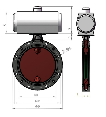 | Model | DN | N-ΦA | B | C | D | E | F | I | Actuator Model |